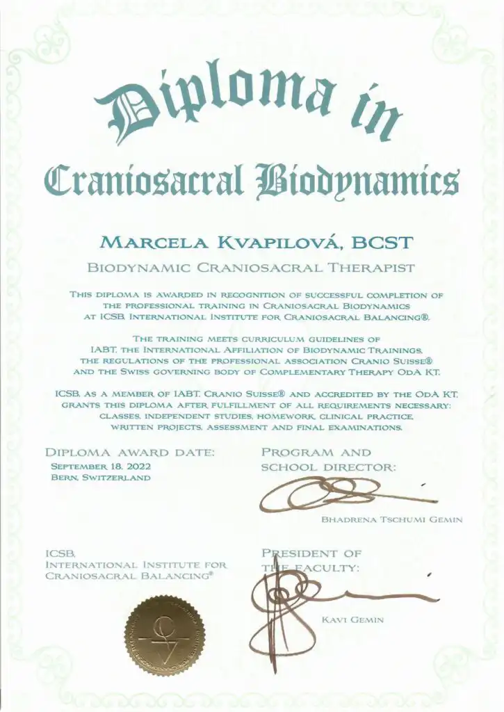 Dalším krokem bylo několik let studia na švýcarském Institut forCranioSacralBalancing (www.icsb.ch). Tento intenzivní program zahrnoval přes 1 000 hodin intenzivní práce!
